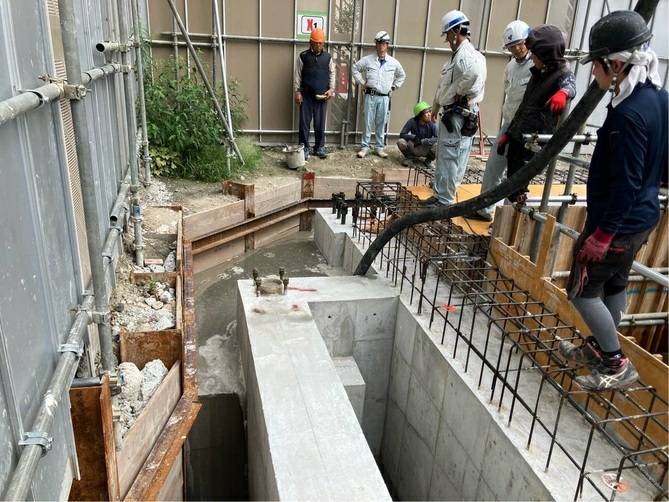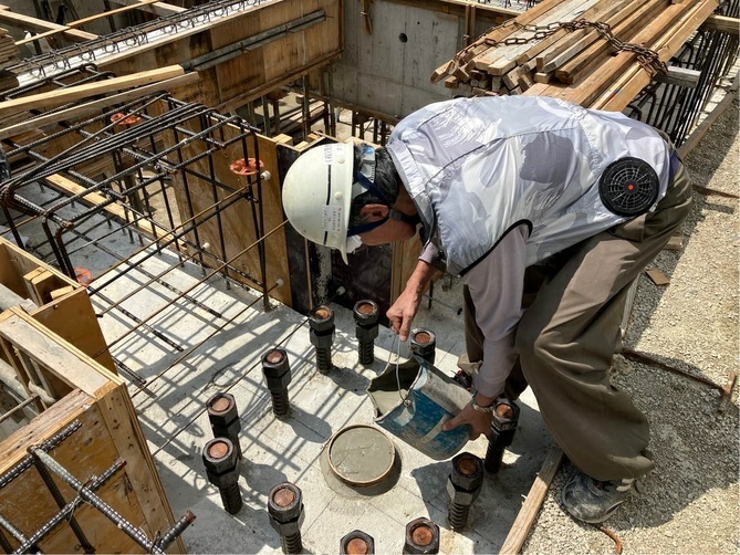 左官工事 柱ベースレベルモルタル(グラウト材)施工状況