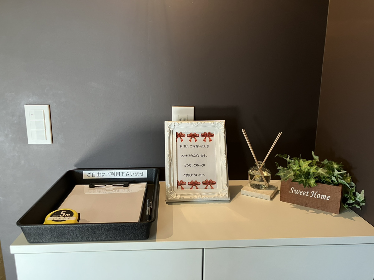 採寸用メジャーやご案内資料を設置し、玄関や室内には小物を取り入れたステージングも実施しました。