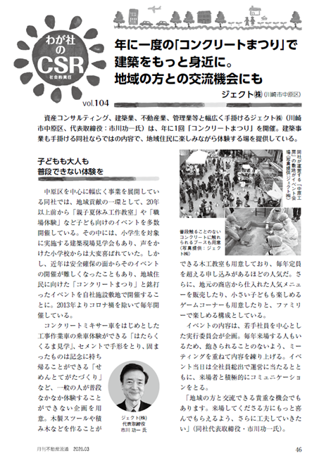記事では、ジェクトが長年にわたり地域貢献活動として実施している「コンクリートまつり」について、CSRの観点より取り上げていただきました。