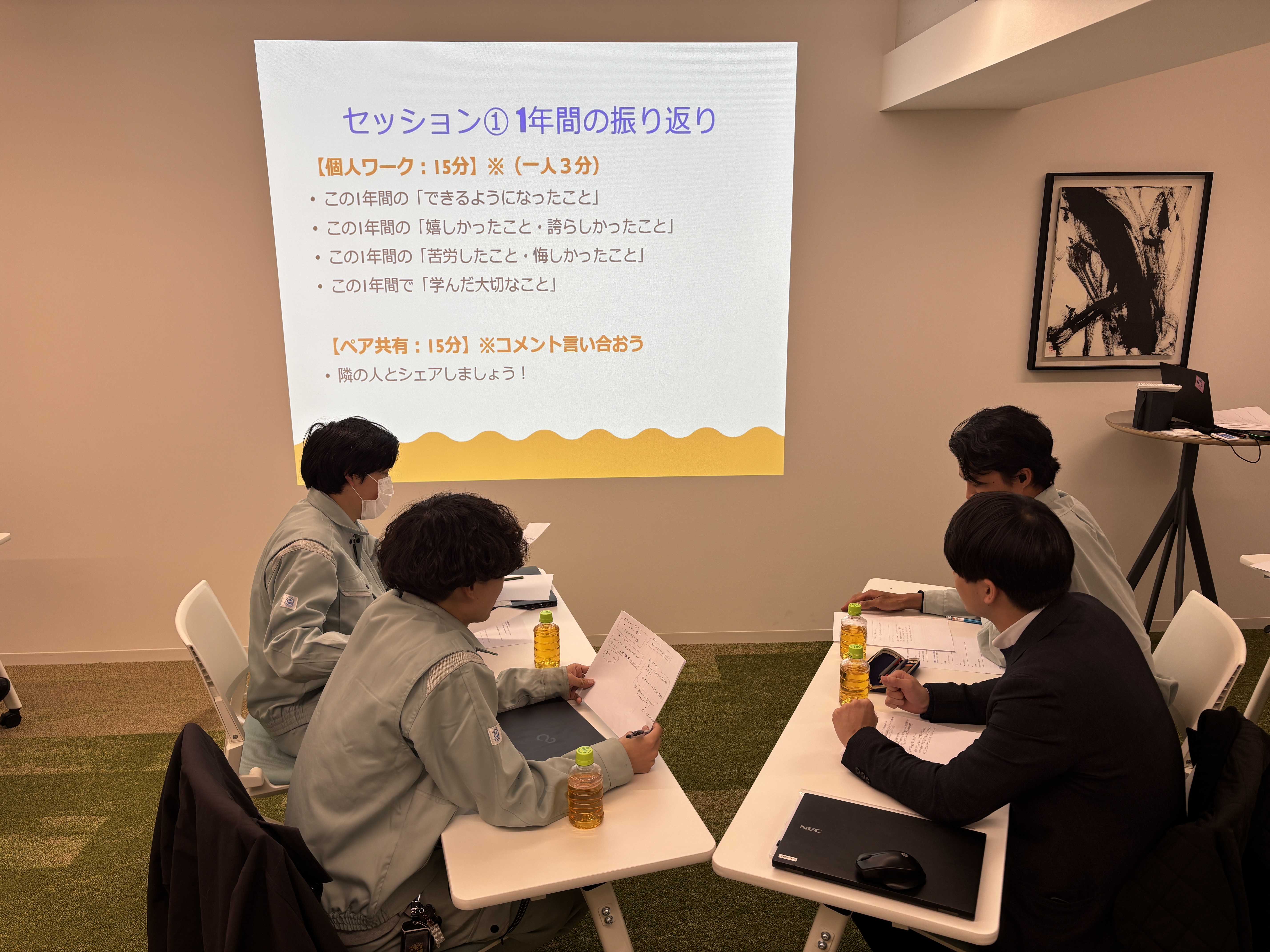 今回の研修では、入社後1年間を振り返るだけでなく、