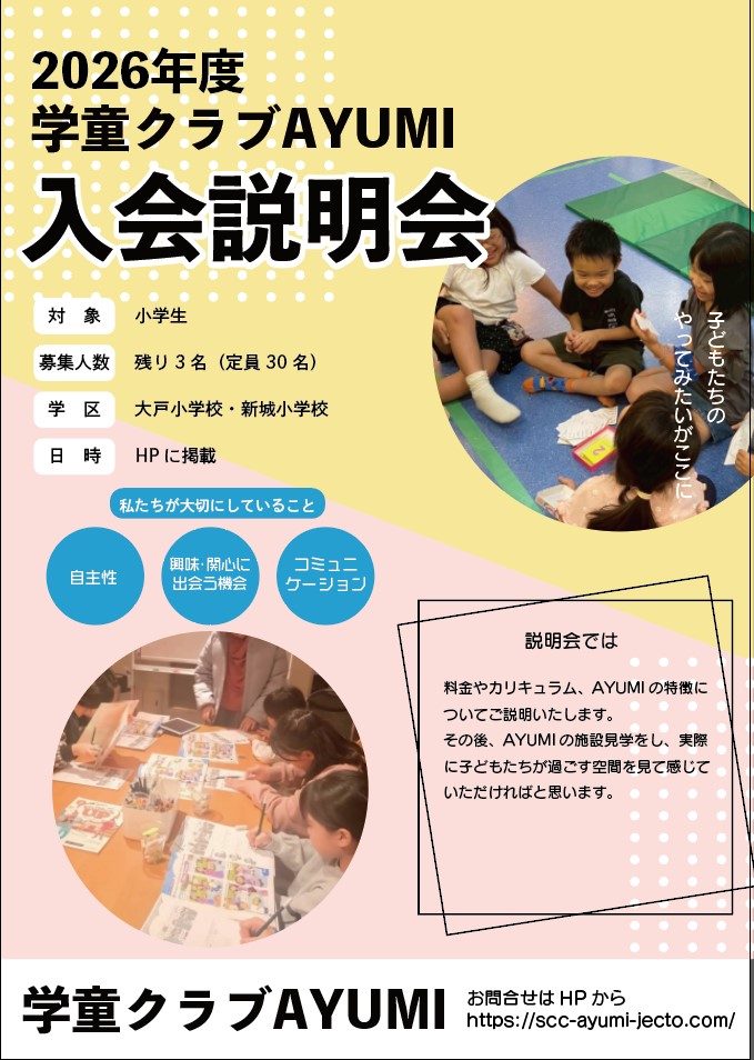 学童クラブAYUMIでは、2026年度の新規入会をご検討の保護者のみなさまを対象に、