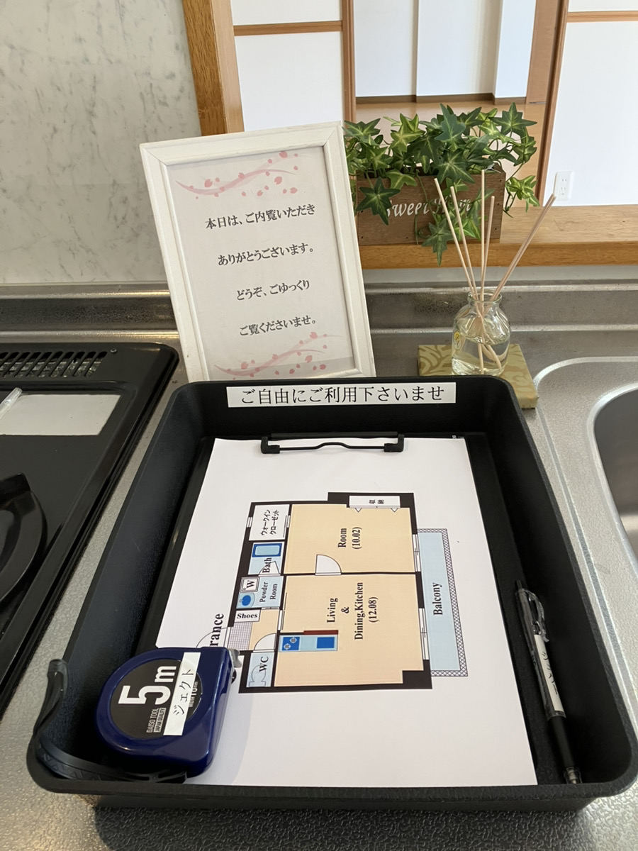 採寸用メジャーやご案内資料を設置し、玄関や室内には小物を取り入れたステージングも実施しました。