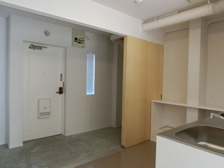 クローゼットも兼ねています。流し台の脇は作り付けの棚と
